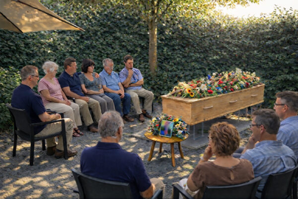 Op één van de foto’s zie je dat de uitvaartkist buiten staat. Het was een mooie dag. Sommige mensen waren al vroeg aanwezig en we hebben hen een drankje in de tuin aangeboden. Terwijl de andere gasten langzaam binnendruppelden, zat iedereen inmiddels al buiten. Ik had een kleine speaker meegenomen voor muziek. Uiteindelijk besloten we om in de tuin te blijven en de kist in ons midden te zetten. Daar hebben we op informele wijze herinneringen gedeeld en naar muziek geluisterd. Zo kan het ook gaan. Soms juist wanneer er geen strak draaiboek is.